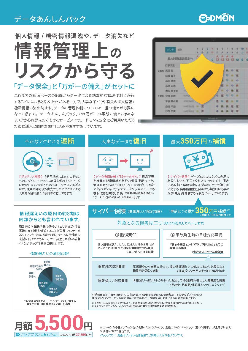 コドモンでは、万が一の事態に備えたオプションサービス「データあんしんパック」をご提供しております。ぜひ一度ご確認ください。